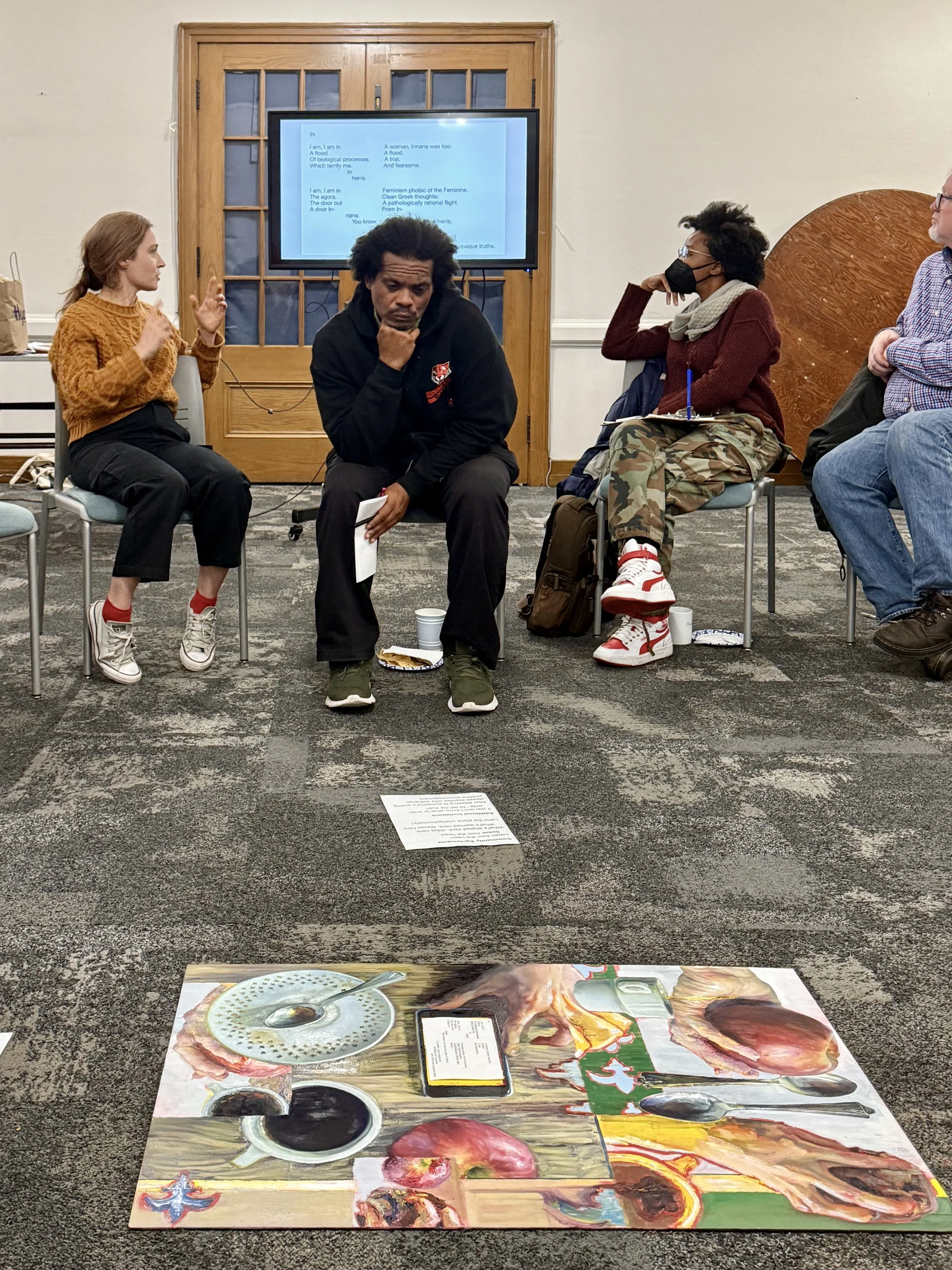 By creating works in oil around poems by myself and others, I am locating this conversation within the following: art/literary history, the language of imagery, and the human practice of creativity. By conducting workshops that make unceremonious use of my paintings, I am allowing this conversation to fuel itself with 'IRL' Direct Messages: that is, products of artistic human expression.